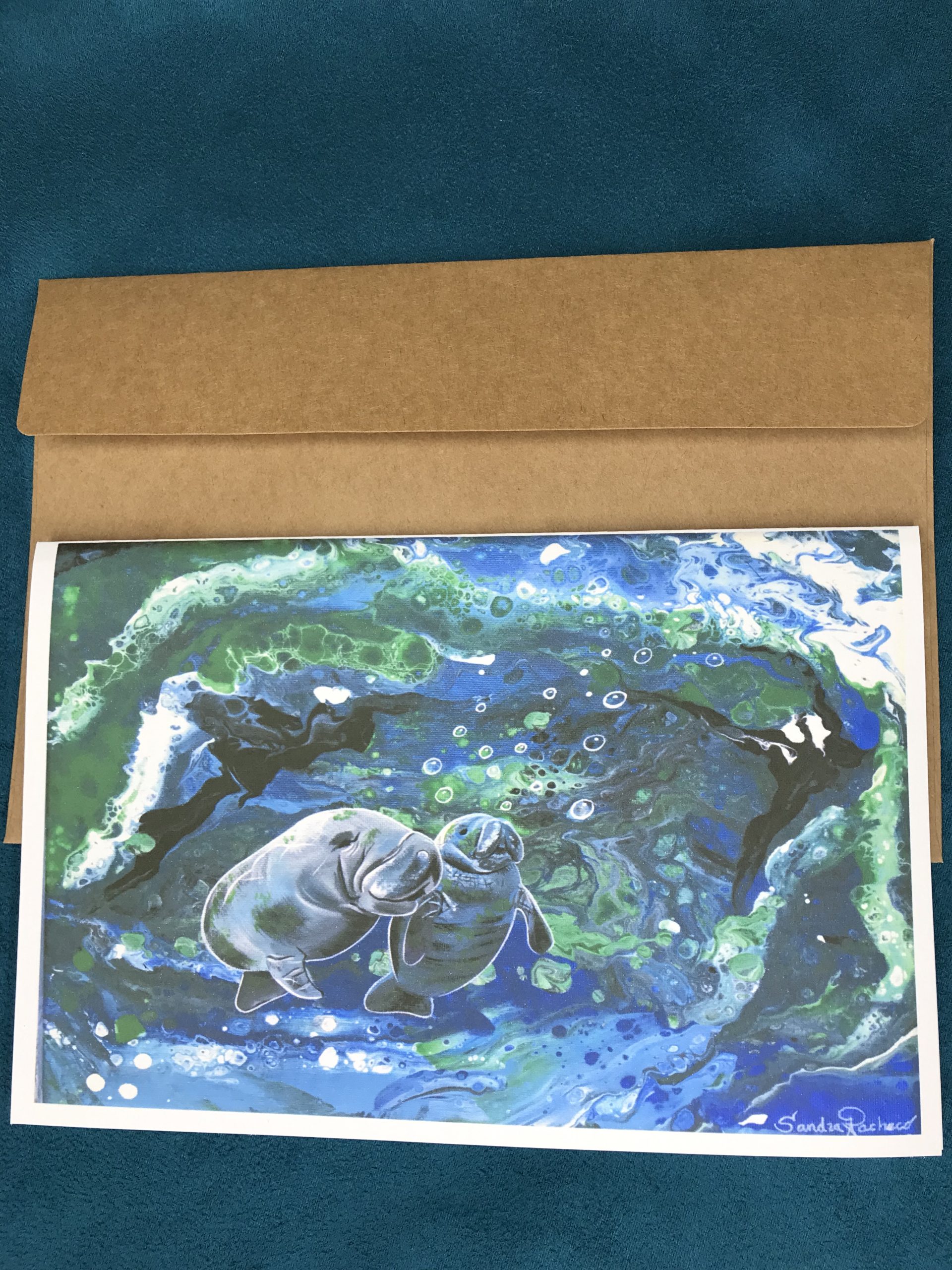 Peaceful Mom and baby manatees,original Art by Sandra available in a 5”x8” Note Card printed in a 100lbs stock paper with brown envelope included, ideal for gift giving or acknowledgment notes for friends or families